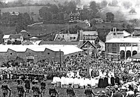 3rd June 1917. Taken from the opposite side of the road. This was the opening Ceremony of the Wayside Cross. The photo shows part of the estate showing unit S1 and S2A. You can see Gydynap Lane in the background. Note that Stag House on the corner of Gydynap Lane has yet to be built.